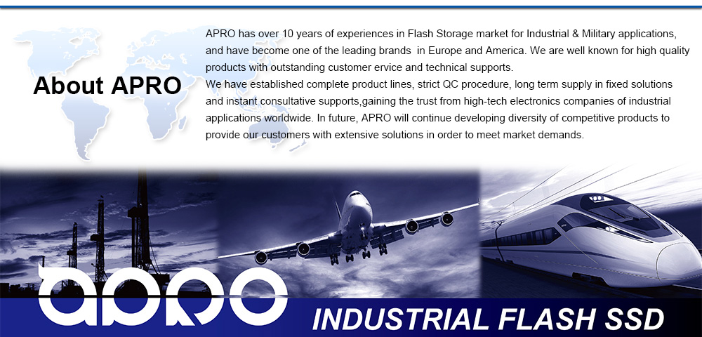 In industrial market, many applications are still in need of legacy embedded storage devices with IDE interface such as Micro IDE Flash Module and PATA SSD, also responding to the demands of MLC products which has been increasing during recent years, APRO persists on fulfilling customer’s need and foresees the requirements; therefore, we’ve strived to satisfy our customer’s desire by providing wide varieties of product options.